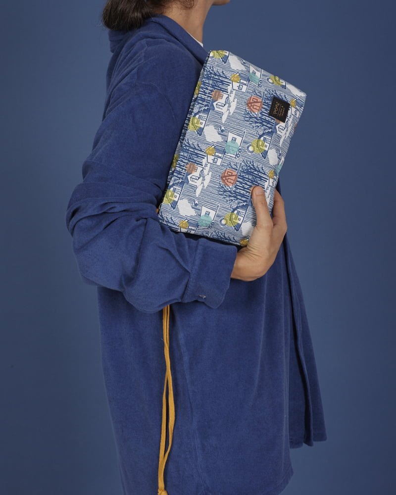 A small toiletry bag with an original print made from recycled PET, a fabric created from plastic bottles. To make it, the plastic is selected, crushed, washed, melted, and turned into pellets. It is then melted again to transform into a thick liquid that will be converted into yarn for making fabrics.