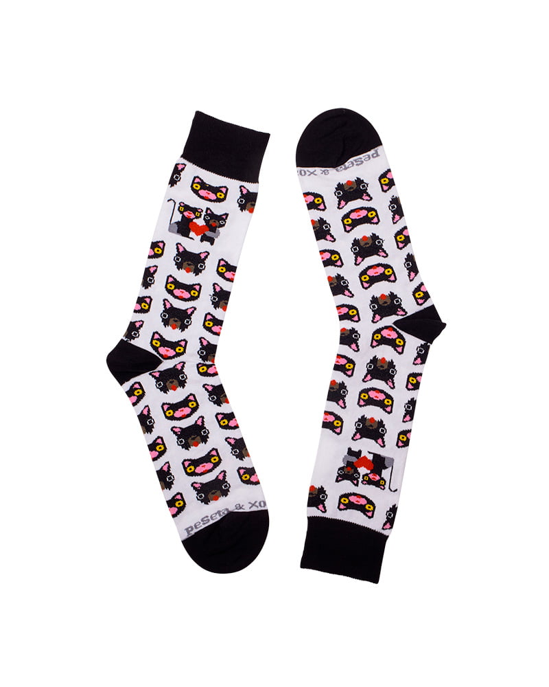 "I can tell you that I really like to illustrate love and especially love between very opposite things, see my illustrations of angel and demon, mermaid and sailor, Indian and cowboy... until now I haven't really explored that concept with animals and animals are something that I've liked to draw since I was little, in fact I keep many illustrations from that time when I drew animals, especially dogs and cats, because during my childhood I grew up surrounded by them and I grew up in a farmhouse in the middle of the Valencian orchard and there have always been cats and dogs, that's why when you made me the proposal I had just come from spending a weekend in Valencia and it came to mind to reflect that in the socks."