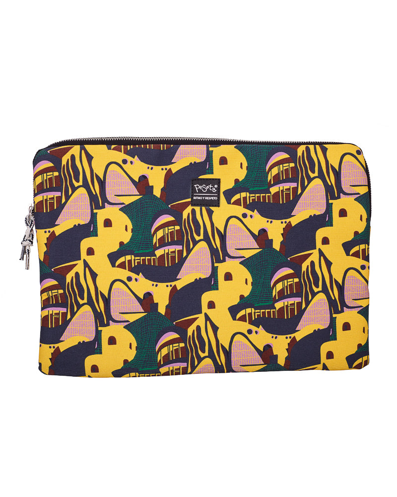 Funda de laptop 13" con estampado original hecha de tejidos de botellas recicladas, estampado Terremoto, diseño original colorido en tonos color tierra resaltando el amarillo,  moda sostenible