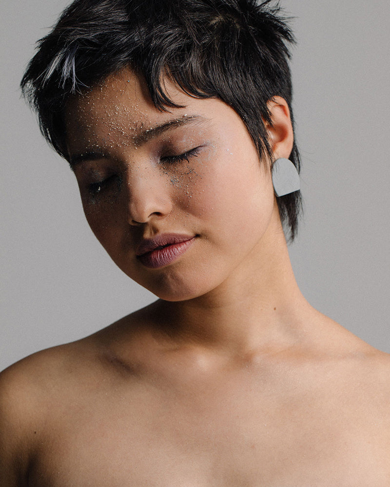 Lightweight porcelain earrings handcrafted with gray-tinted porcelain. The backs of the earrings are handcrafted in silver, where you'll find the engraved logo.