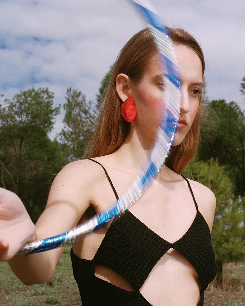 “Marlis” earrings printed in 3D with 100% biodegradable PLA filament with crystal methacrylate, silver hoops, surgical steel earring base, hypoallergenic.
