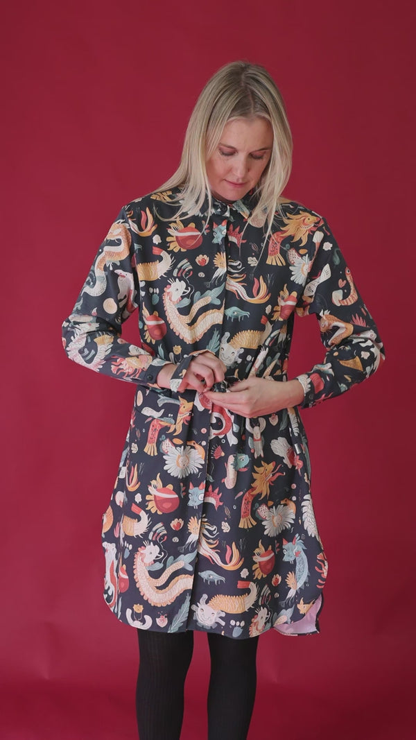 El vestido lleva botones ocultos debajo de la tapeta hasta abajo y puede llevarse tanto cerrado como abierto tipo blusón.