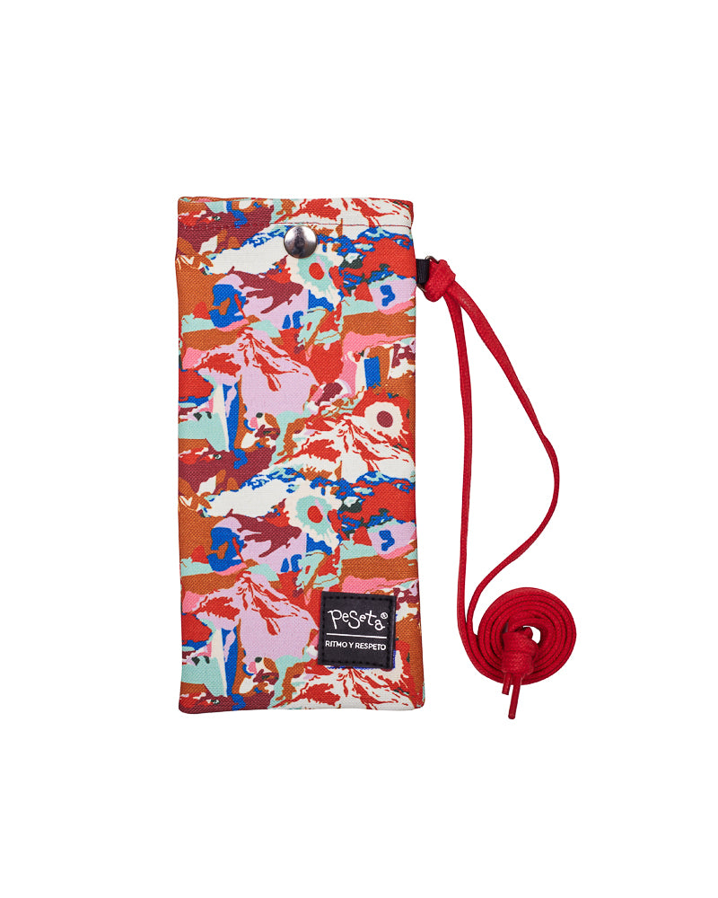 Funda de gafas o móvil con estampado original hecha de tejidos hechos a partir de botellas PET. Para fabricarlo, se selecciona el plástico, se tritura, se lava, se funde y se convierte en granza. Luego vuelve a fundirse para transformarse en un líquido espeso que se convertirá en hilo con el que se harán los tejidos.