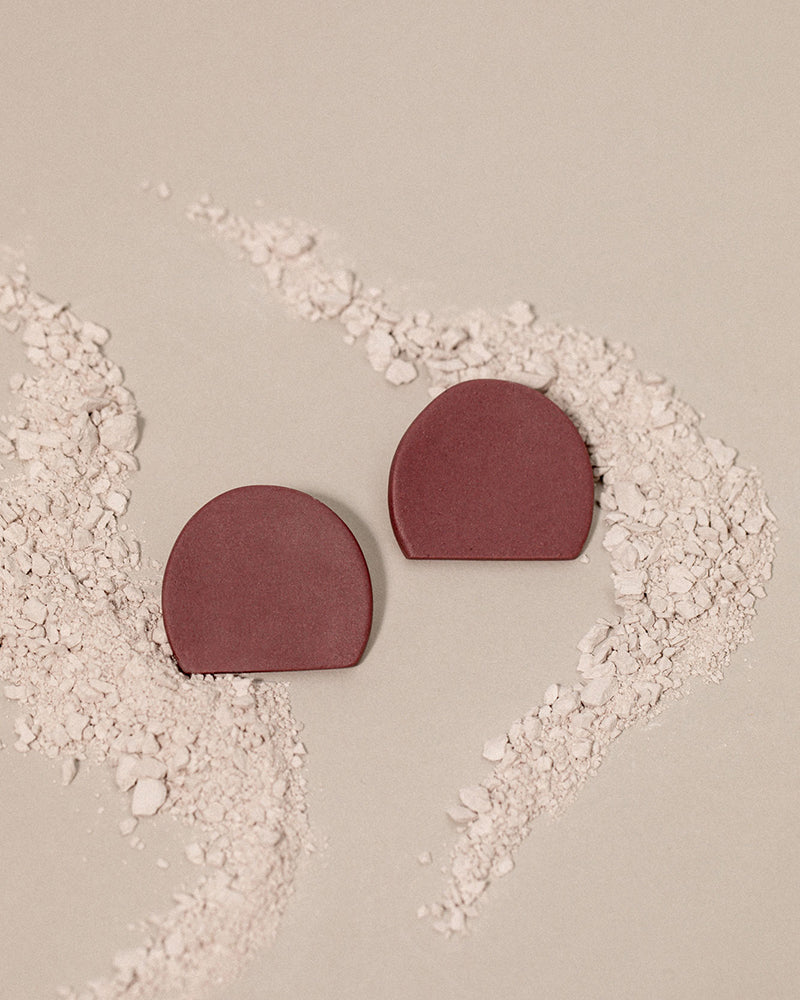 Pendientes de porcelana ligeros elaborados de forma artesanal con porcelana teñida color morado. La trasera de los pendientes es de plata, elaborada de forma artesanal, donde encontrarás el logotipo grabado.
